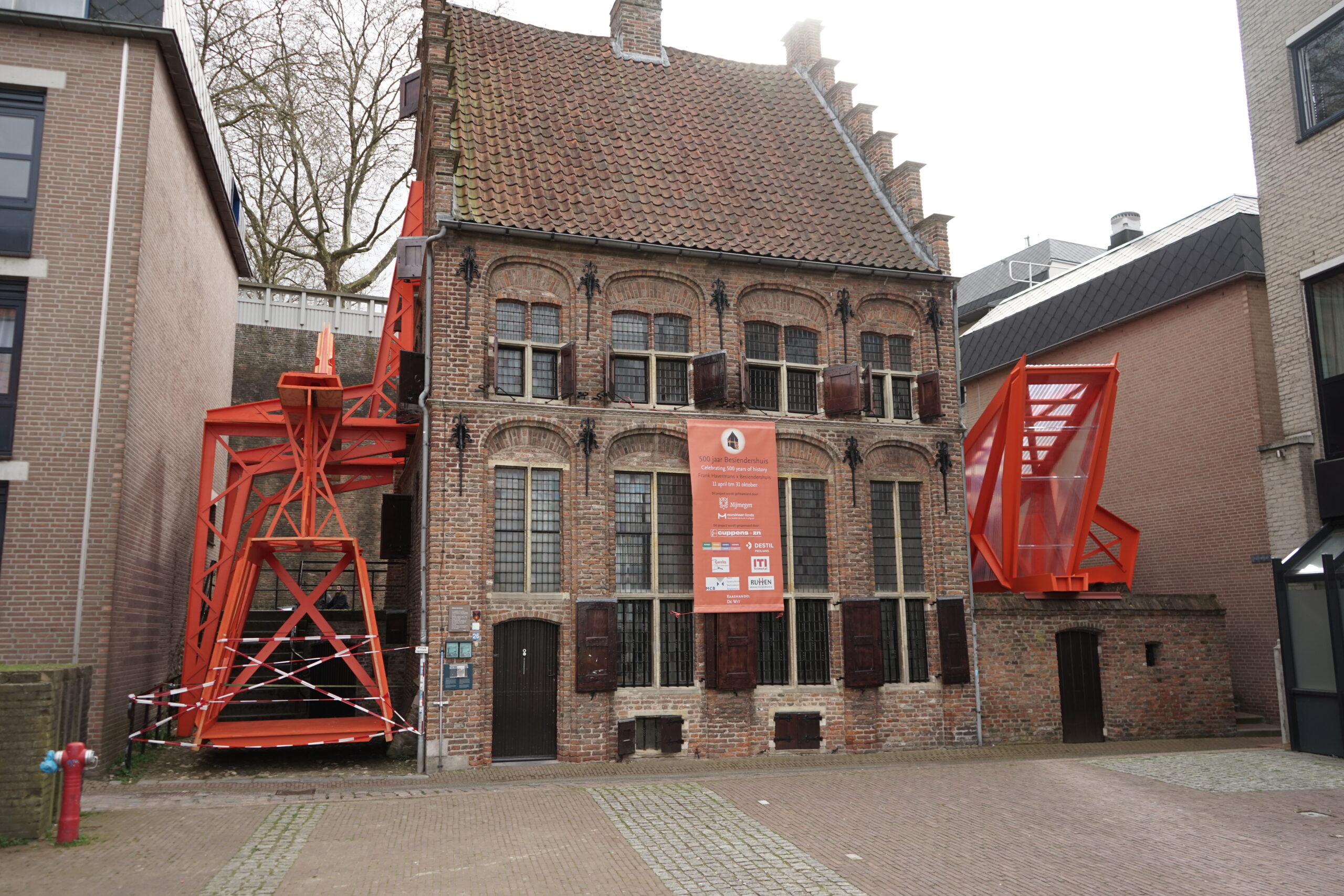 NIJMEGEN – Aan de Waalkade bij het Besiendershuis is zaterdagmiddag een metershoog feloranje kunstwerk geplaatst ter gelegenheid van het 500-jarig bestaan van het rijksmonument. Het opvallende werk van beeldend kunstenaar Frank Havermans wekt de indruk van steigers of ondersteuning, maar blijkt bij nadere beschouwing een artistieke constructie.