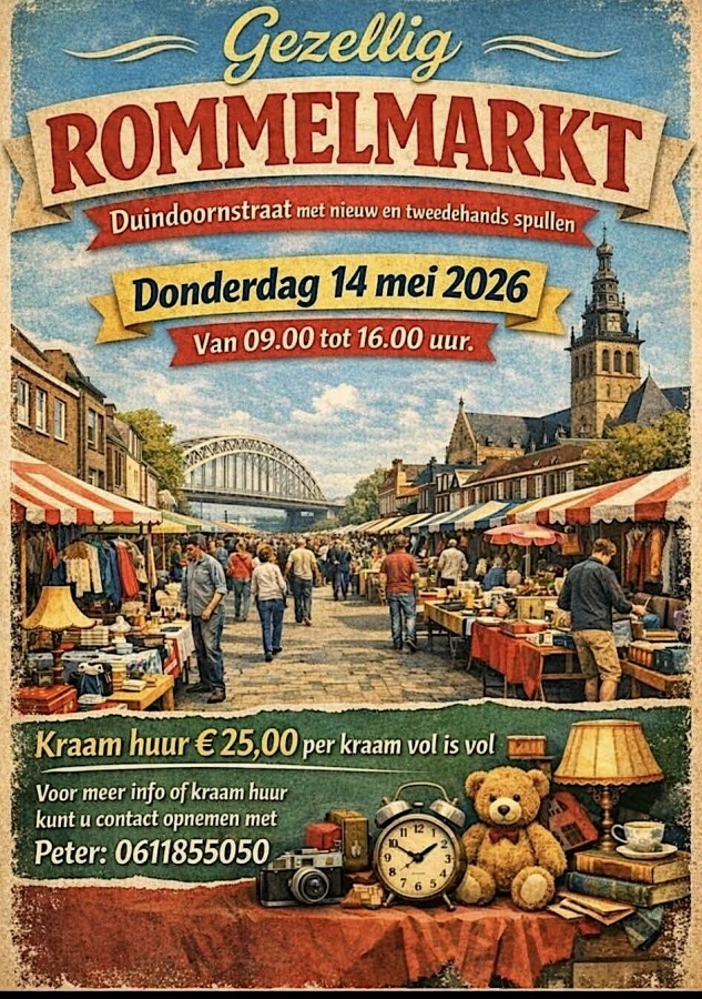 Nijmegen Nieuw West – Op donderdag 14 mei 2025, tijdens Hemelvaartsdag, verandert de Duindoornstraat in Nijmegen weer in een bruisende marktplaats. Liefhebbers van vintage, curiosa en verborgen schatten kunnen hun hart ophalen bij de vele kramen die door de straat opgesteld staan. Het is dé plek om voor een prikkie unieke vondsten te scoren of gewoon te genieten van de gemoedelijke sfeer die deze kleinschalige buurtmarkt zo typeert.